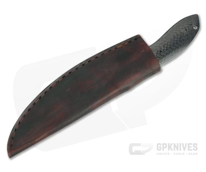 Handle: Subtly contoured carbon fiber handle scales ride proud to dovetailed Chad Nichols stainless Damascus bolsters, a feature prevalent on the knives of John W. Smith, Aaron’s father-in-law. The bolsters contrast nicely with the dark, rich carbon fiber to deliver striking character and balance to this piece. Simple and ergonomic, the handle has subtle grooves for a secure and versatile grip.