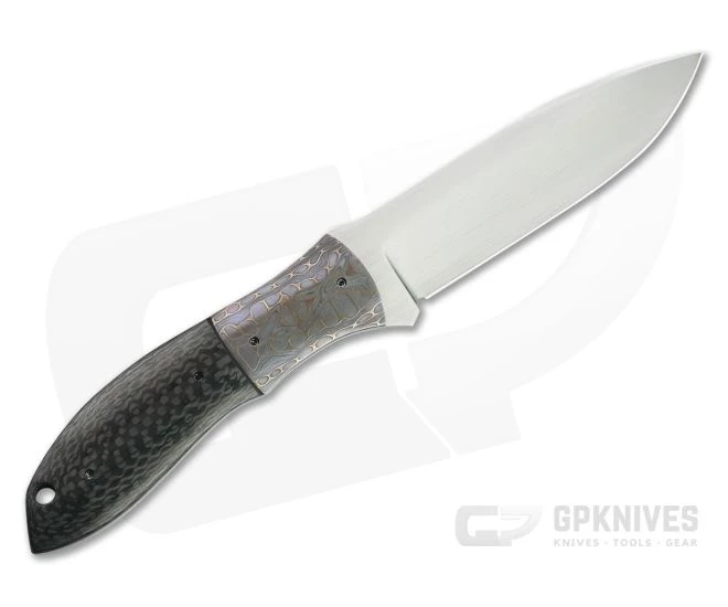 The Aaron Frederick 3PS is a functional and stylish custom fixed blade with appeal for users and collectors alike. This piece has a hand rubbed satin CPM-154 blade, Chad Nichols stainless Damascus bolsters and carbon fiber handle scales.