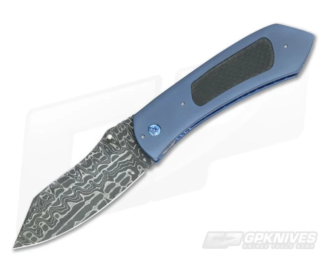 This hand-made Custom Large Folder by Aaron Frederick features Chad Nichols stainless Cheetah Damascus and a Blue Titanium with Carbon Fiber Picture Frame handle. Just exquisitely crafted, every small detail by hand. It is large, but so well balanced and light in the hand for it’s size. This one is brand new direct from Mr. Aaron Frederick.