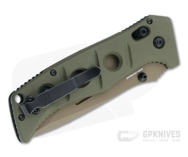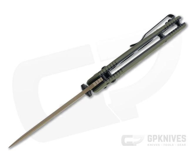 Handle:Â Machined, olive drab G10 handle scales are attached to skeletonized black oxide stainless steel liners offering a tough build and generous grip for even the largest gloved hands. Milled holes and strategic jimping enhance traction in the hand. Tough and reliable, the ambidextrous AXIS lock is simple to operate even with gloves. A generous hole is provided for lanyard attachment.