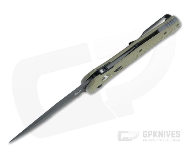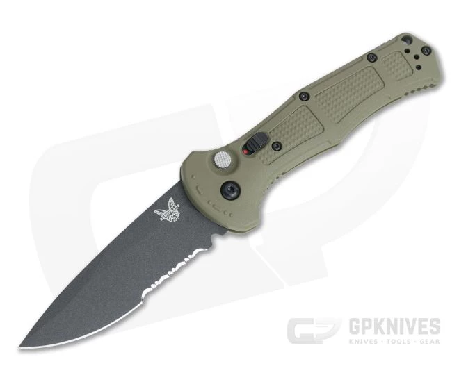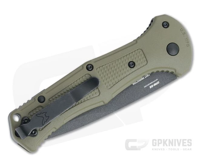 The Benchmade Claymore builds off the popular Black Class folder the Turret, blending every day utility with tactical functionality. The Claymore is a budget friendly button lock automatic that gives you a robust auto that is light enough for everyday carry while being reliable for hard use. Textured Grivory handles reduce weight while providing a durable and extremely low maintenance handle paired with a CPM-D2 blade to tackle a variety of cutting tasks. This version comes with a matte Cobalt Black, poly-ceramic Cerakote finished, partially serrated blade and Ranger Green handles.
