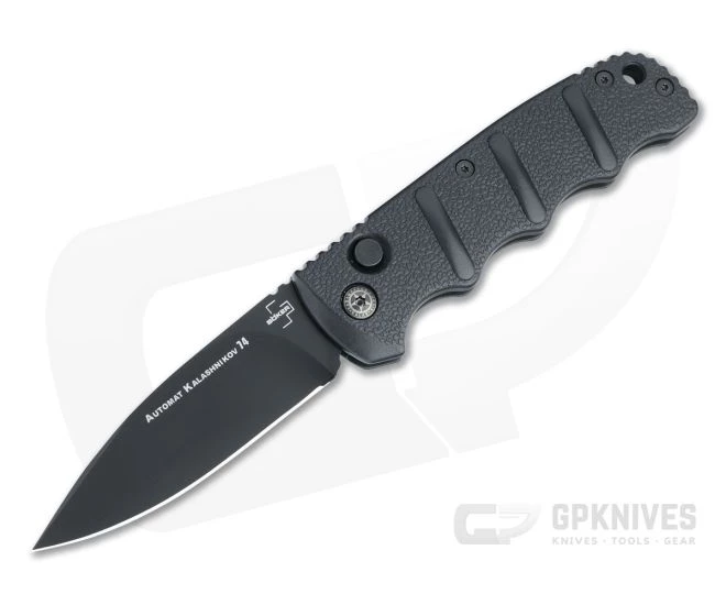The Boker Kalashnikov 74 automatic is a full size budget friendly option as an entry into the world of automatic knives and a solid choice for EDC weighing in at under 4 ounces! The flat ground blade deploys fast and smooth via the button lock mechanism and the grooved aluminum handles provide comfort and security. This version comes with a black coated D2 tool steel blade and black aluminum handles.