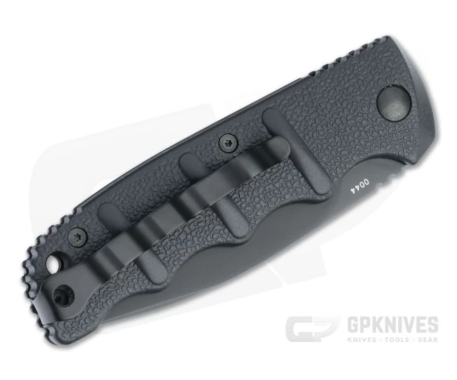 Handle: The black aluminum handles are tough, lightweight, and feature finger groves that lock the knife securely in the hand. The handles have a random texture and contoured traction bumps that work in conjunction with the finger grooves delivering a solid four finger grip. The button lock mechanism is smooth, solid, and reliable for safe operation.