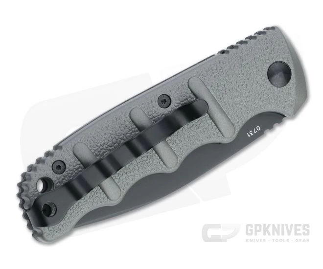 Handle: The gray aluminum handles are tough, lightweight, and feature finger groves that lock the knife securely in the hand. The handles have a random texture and contoured traction bumps that work in conjunction with the finger grooves delivering a solid four finger grip. The button lock mechanism is smooth, solid, and reliable for safe operation.