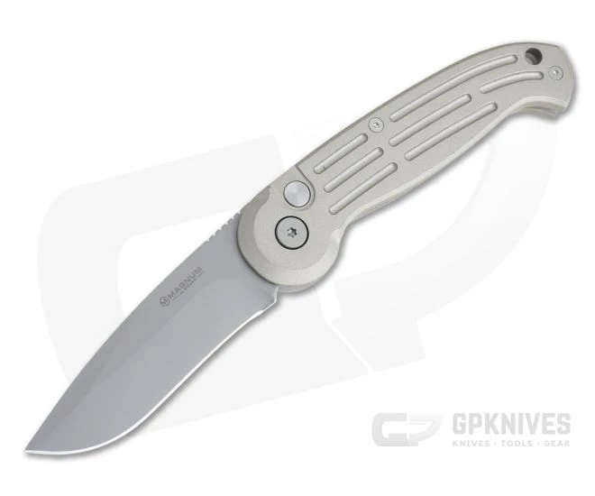 The Boker Magnum SpeedMaster automatic is a budget friendly tactical folder with solid performance and a practical design. This version comes with a blasted matte gray AUS-8 stainless steel drop point blade and milled, gray aluminum handle scales.