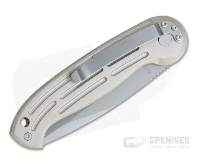 Blade:Â The recurve drop point blade is made from blasted matte gray AUS-8 stainless steel for balanced performance. A saber grind and top swedge offer solid slicing and piercing with good durability. A coil spring automatic mechanism delivers smooth and reliable deployment via the button lock mechanism.