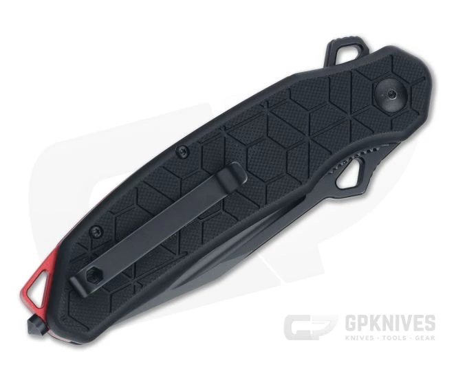 Handle: Inset stainless steel liners support chamfered black G10 milled with a honeycomb texture for superior traction. A pronounced thumb scoop works with the thumb ramp on the blade allowing for added pressure in piercing and slicing. A red anodized aluminum back spacer protects the edge during carry and is milled for added traction with an exposed lanyard hole at the pommel. A hardened steel glass breaker delivers added versatility to this tactical folder. Includes a padded nylon zip pouch for transport and storage.