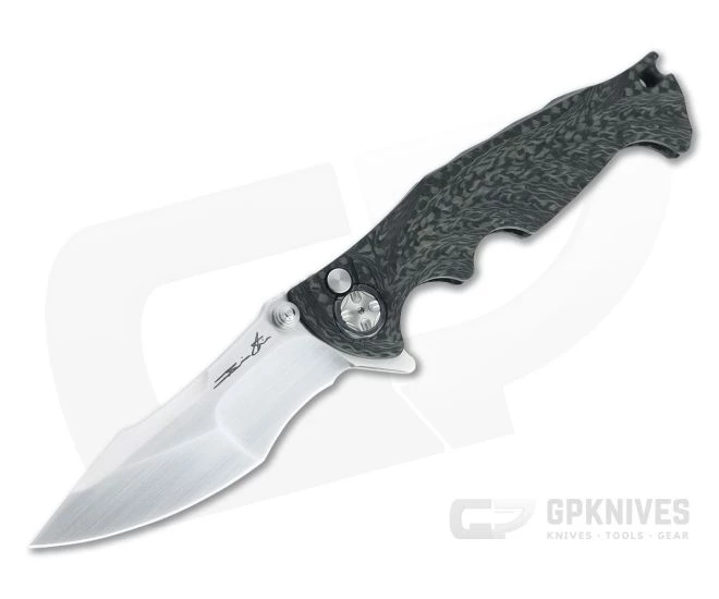 Handle: A solid piece carbon fiber is milled to create the integral handle with fluted milling and finger grooves providing excellent security in the hand. The fluted pattern on the sides gives the knife an organic and futuristic look, while exposing the carbon fiber pattern for added visual appeal. A robust button lock mechanism delivers rock solid lockup and secure operation. The Small Tighe Breaker is slim and easy to carry while still offering a full, four finger grip, and premium details like the custom pivot hardware with zirconium collars and end milled channel for lanyard attachment. Includes signature Brian Tighe padded zipper pouch.