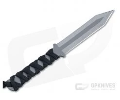 Blade: Full tang, 2.7 mm thick 1075 carbon steel construction gives this mini gladius a robust construction with a two-tone blasted and satin finish and dual saber ground edges and the iconic piercing point that defines the design. Offering four plain cutting edges, the knife is versatile for utility work despite the martial inspiration.