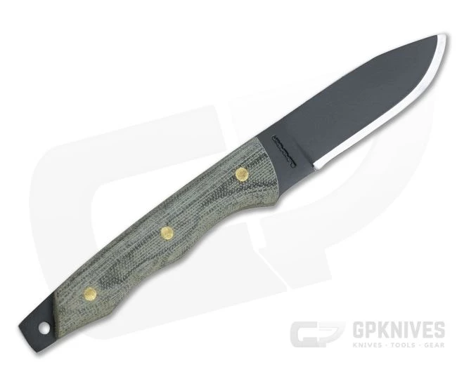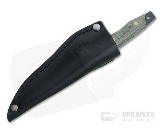 Handle: Canvas Micarta scales are attached with epoxy and brass pins for reliable security. Micarta is durable and weather resistant while offering enhanced traction even when wet. Finger grooves provide added security in the hand while the exposed pommel end is milled with a hole for lanyard attachment. For added utility the pommel can be used as an impact or pry tool.