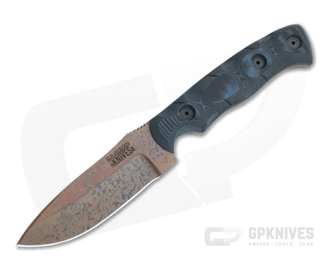 The Dawson Huntsman lives up to its name as a well-thought-out, full size hunting knife, as well as making a solid tactical fixed blade. Dawson utilizes American-made, CPM 3V powder metallurgy steel which offers exceptional toughness with edge holding up to three times longer than D2 and a clear Cerakote coating for corrosion resistance. This version comes with blue and black G10 handle scales and an Arizona Copper finished blade.