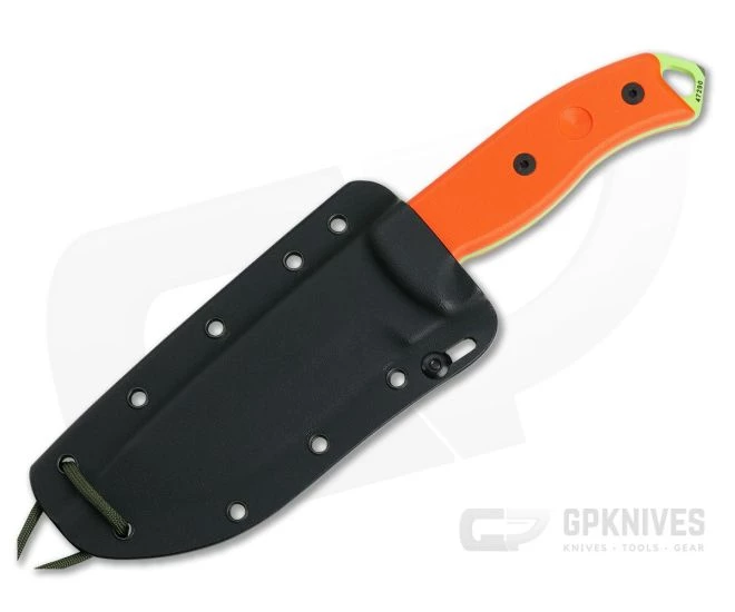 Handle:Â The handle of the knife consists of two beefy Orange G10 scales bolted to the full tang construction with black oxide finished Allen bolts. The peel ply texture of the G10 offers traction even when wet and provides some of the highest durability as well as resistance to moisture and chemicals for no fuss, no muss, low-maintenance. The bright Orange of the G10 paired with the vibrant color of the blade keeps this ESEE 5 easy to spot in the brush. The front scale sports a divot for bow drill fire making. The exposed tang at the pommel has a large hole for lanyard attachment, glass breaker point and serial number.
