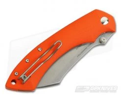 Handle: A simple and solid stainless steel liner construction offers secure lock up and reliability and supports durable, Orange G10 handle scales with milling for traction in the hand. The handle is ergonomic and comfortable enough for extended use. A partial backspacer protects the blade in the closed position and enhances the balance in-hand. A large hole at the pommel allows for lanyard attachment. Satin Torx hardware rounds out the construction.