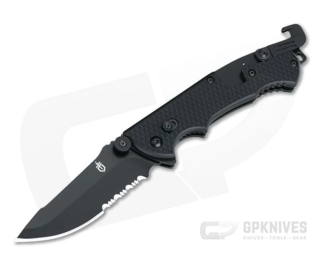 The CLS or Combat Life Saver Knife is a classic Rick Hinderer design executed in a durable yet affordable package by Gerber Knives. Built for tactical use in a combat environment the CLS is equipped with a Harpoon-tipped, partially serrated blade, folding belt cutter, glass breaker pommel and oxygen wrench in the handle. Like the Gerber Hinderer Rescue Knife, the CLS is a dependable tool for military, police and first responders who need a multi-functional they can count on. This version comes with a black coated blade and Black GFN handle scales.