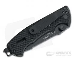Handle: Built on robust steel liners the handle is ergonomic with or without gloves with traction added via black “Hinderer texture” GFN scales. A slide operated liner lock delivers security in use and keeps your fingers clear of the blade when closing. One side of the handle is equipped with a folding belt cutter and the other features a built-in oxygen wrench. The half-length steel back spacer ends in an extended pommel with lanyard hole and glass breaker tip.