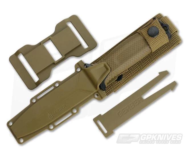 The Sheath:Â Hard plastic sheath with MOLLE compatible webbing for drop-leg carry and secondary retention and detachable belt hoops for horizontal belt carry.