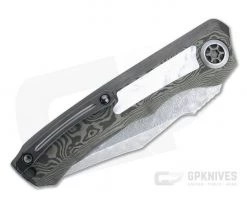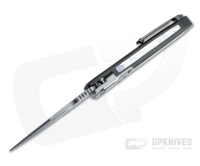 Handle: A single milled piece of Black Dunes carbon fiber from Fat Carbon, inlaid with beautiful mother-of-pearl on all sides, forms the integral chassis housing the blade and button lock mechanism making for a durable yet lightweight construction. The button lock is smooth and reliable with rock solid lockup. A Vegas Forge Damascus bolster, matching rear pivot collar, and DLC coated titanium hardware and clip complete the construction. Included: box, zipper pouch with patch, and “Certificate of Badassery”.