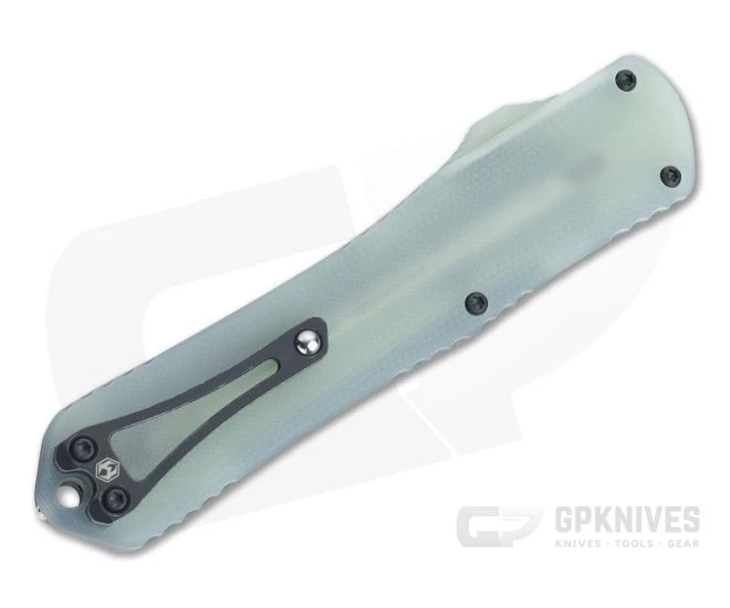 The Heretic Knives Manticore-X is the largest of the Manticore Series of double action, out the front, automatic knives. The Manticore-X has a countered, 3D machined, aircraft grade aluminum handle with strategically placed scallops around the edge that delivers a comfortable and secure grip in the hand. This version comes with a Battleworn black Elmax Tanto blade, black anodized aluminum frame and translucent Jade green G10 back cover with matching slide.