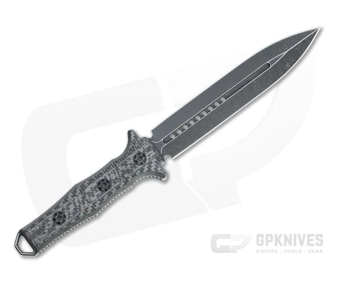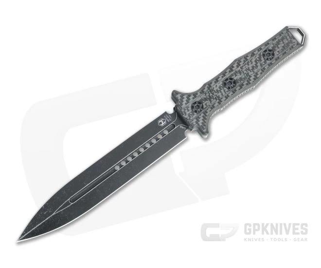 Handle:Â The full tang blade supports chamfered 3D machined carbon fiber handle scales that are securely attached with custom Battleworn Black Torx hardware. Deep jimping machined on the spine provides exceptional traction, while the cross guard keeps the hand safely off the blade.