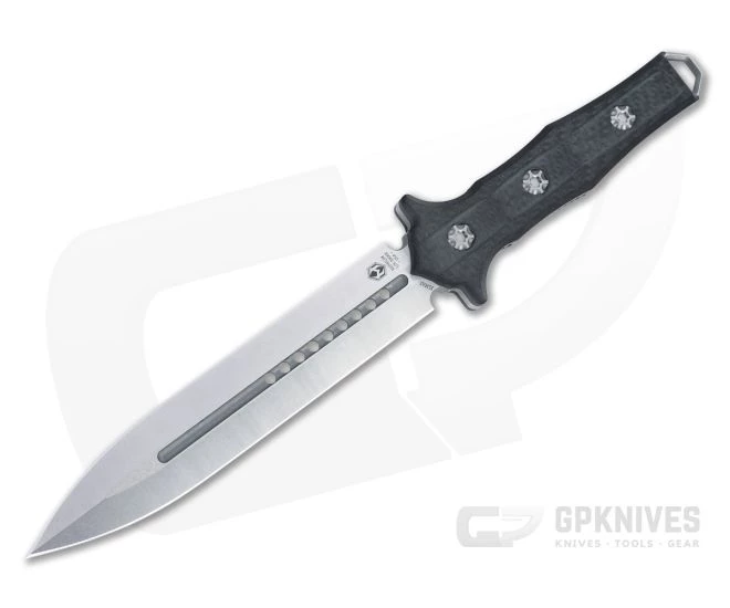 Handle: The full tang blade supports 3D machined and contoured carbon fiber handle scales that are securely attached with custom stainless steel Torx hardware. The spine is machined with deep jimping for exceptional traction while the cross guard keeps the hand safely off the blade. An exposed pommel end is milled for lanyard attachment.