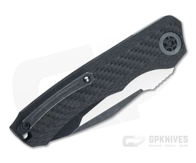 Handle:Â A single piece of carbon fiber is milled as the integral chassis housing the blade and button lock mechanism making for a durable, lightweight construction. The button lock is smooth and reliable with frag pattern texture for positive engagement, with additional frag milling on the front of the handle for added traction. A Jade Green G10 bolster, Battleworn Black titanium hardware and matching clip round out the construction with a generous lanyard hole.