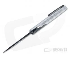 Handle: Milled from a single billet of 6061 aluminum the integral chassis houses the blade and button lock mechanism in this durable yet lightweight build. The silver aluminum handle has a blasted and tumbled “Blizzardworn” finish that complements the blade. The button lock is smooth and reliable with frag pattern texture for positive engagement and additional frag milling on the front of the handle for added traction. Construction includes a carbon fiber bolster, black titanium hardware and matching clip.