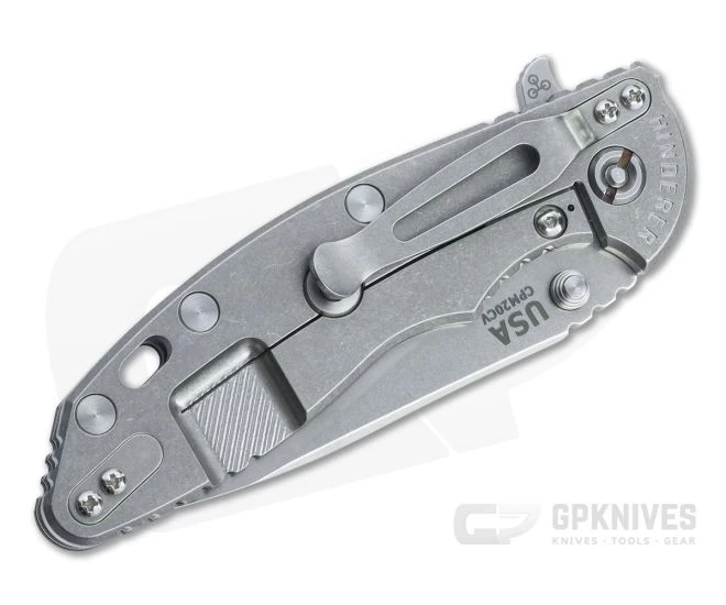 Handle:Â Full titanium frame lock and liner are stonewashed for a rugged, wear hiding look with visual appeal. Satin hardware and standoffs create one solid package, while a 3D textured G10 scale and strategically placed jimping provide a solid grip. Additional features include the Hinderer LockBar Stabilizer, titanium clip insert and fully customizable modular design.