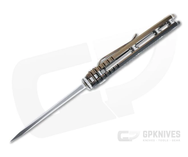 Handle: Titanium frame and liner come in a matching bronze stonewashed finish that hides wear with style while the textured G10 scale and jimping provide a secure grip. Equipped with a steel lock face insert, the integral frame lock has solid lockup and smooth operation for safe use. The Hinderer LockBar Stabilizer, titanium clip insert and hardware make this a fully customizable modular design.