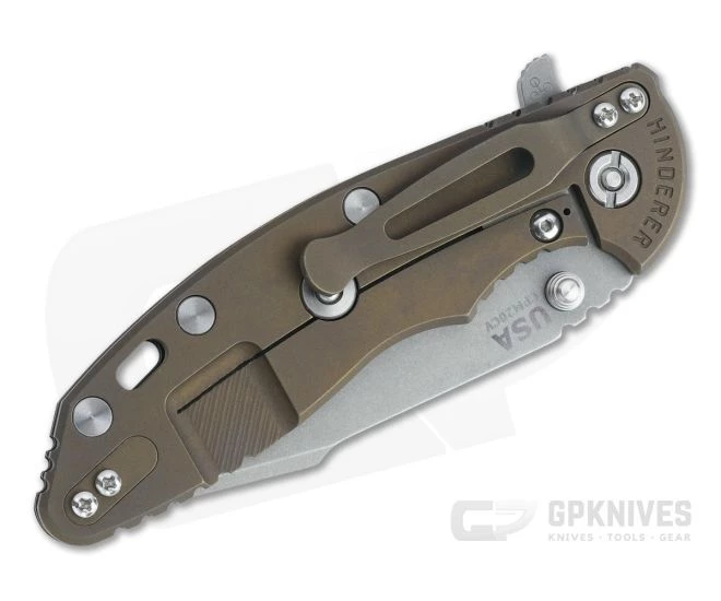 Handle:Â Full titanium frame lock and liner are matching Battle Bronze (anodized Working Finish) that looks great while hiding wear from carry. Satin hardware and standoffs create a solid handle while a 3D textured G10 scale coupled with strategically placed jimping delivers traction in hand. Additional features include the Hinderer Lockbar Stabilizer, titanium clip insert and customizable modular design. The Skinny design reduces thickness and weight for a better carry experience.