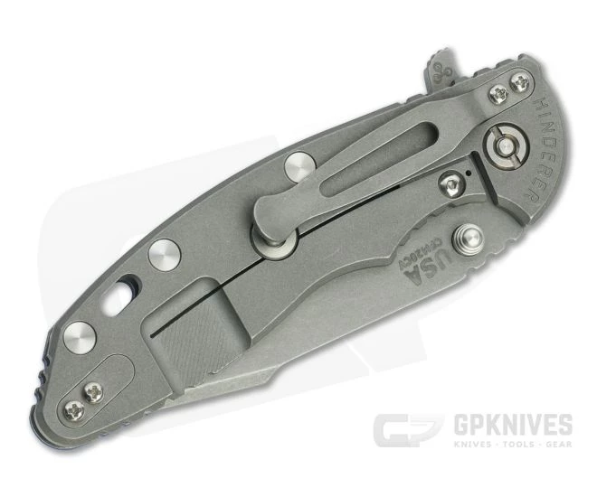 Handle: Full titanium frame lock and liner have a matching stonewashed finish that look great while hiding wear from carry. Satin hardware and standoffs create a solid handle while a 3D textured G10 scale coupled with strategically placed jimping delivers traction in hand. Additional features include the Hinderer Lockbar Stabilizer, titanium clip insert and customizable modular design. The Skinny design reduces thickness and weight for a better carry experience.