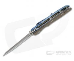 Handle: Full titanium frame lock and liner have a blue anodized stonewashed finish that is rugged and hides wear well while still having a striking visual appeal. Satin Hardware and standoffs create one solid package while a 3D textured G10 scale coupled with strategically placed jimping provides a solid grip. A blade choil allows for a more forward grip for controlled work. Additional features include the Hinderer Lockbar Stabilizer, titanium clip insert and customizable modular design.