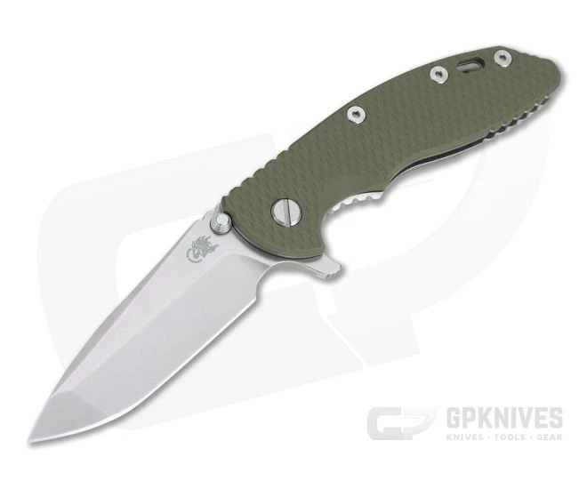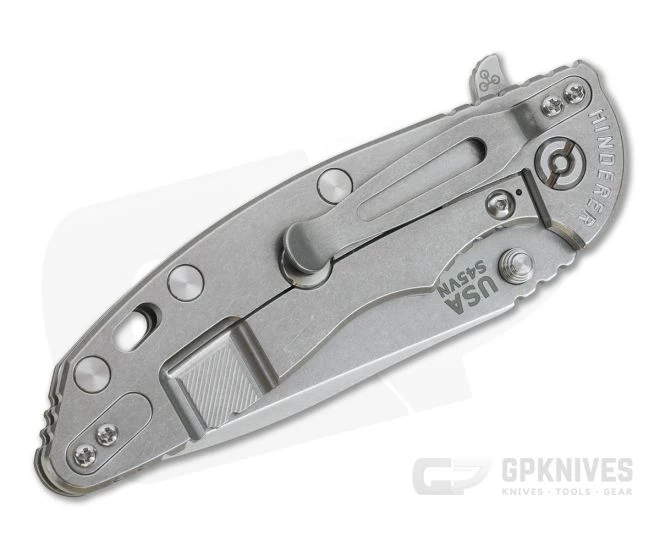 Handle:Â Full titanium frame lock and liner have a stonewashed finish that is rugged and hides wear well while still having a striking visual appeal. Satin Hardware and standoffs create one solid package while a 3D textured G10 scale coupled with strategically placed jimping provides a solid grip. A blade choil allows for a more forward grip for controlled work. Additional features include the Hinderer Lockbar Stabilizer, titanium clip insert and customizable modular design.