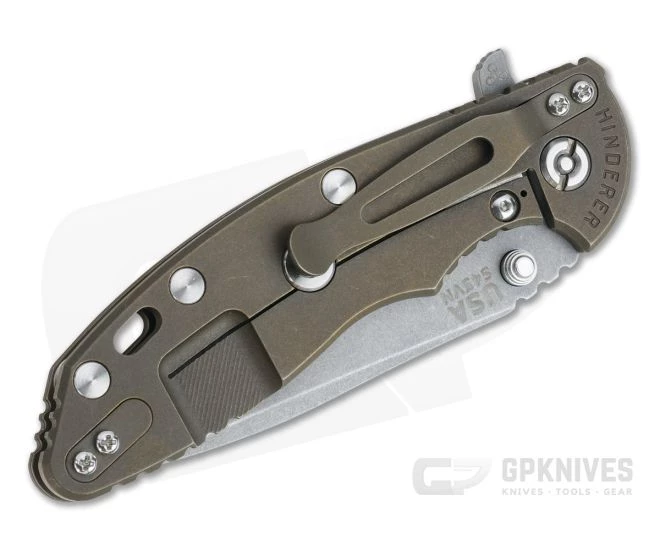 Handle:Â Full titanium frame lock and liner have a matching Battle Bronze finish that hides wear well while maintaining a rugged style. Satin Hardware and standoffs create one solid package while a 3D textured G10 scale coupled with strategically placed jimping provides a solid grip. A blade choil allows for a more forward grip for controlled work. Additional features include the Hinderer Lockbar Stabilizer, titanium clip insert and customizable modular design.
