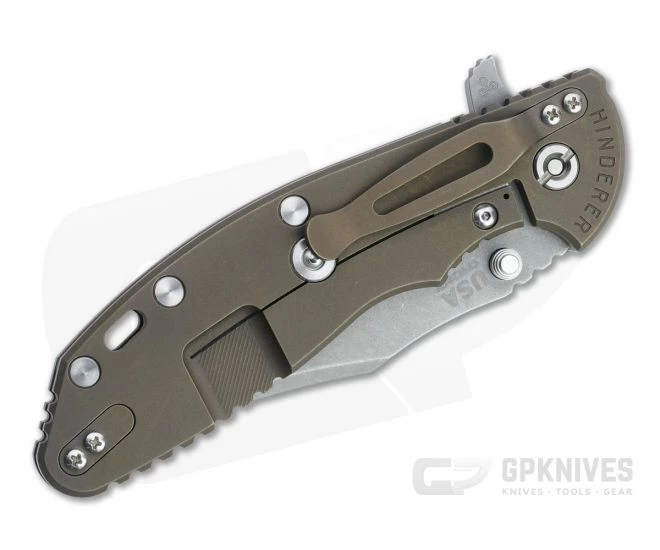 Handle: Titanium frame and liner come in a matching Battle Bronze finish, anodized Working Finish, that hides wear with rugged style while the textured G10 scale and jimping provide a secure grip for large hands and gloved users. Equipped with a steel lock face insert, the integral frame lock has solid lockup and smooth operation for safe use. The Hinderer LockBar Stabilizer, titanium clip insert and hardware make this a fully customizable modular design.