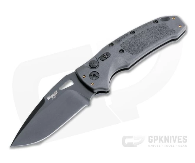 Handle:Â Durable polymer handles are chamfered for comfort with a deep thumb scoop exposing jimped liners for traction. Matching your P320, this Legion comes with a solid gray handle and high traction molded texture. A double choil design locks the knife in hand for security in any situation while the smooth, button lock delivers rock solid reliability backed by a slide safety for secure carry. The louvred clip design adds traction for positive draw without added drag in pocket transition.