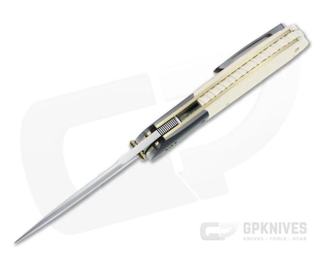 John W. Smith is a tactical folding knife legend. His pieces can be hard to come by, and when they do come around they go fast! The reason: these custom pieces are a part of knife making history. Simple, refined, and flawlessly executed, a John W. Smith custom is a jewel in any collection. The Fusion is a tactical design with a more compact size for carry. This piece has a hand rubbed satin CPM-S45VN blade, zirconium bolsters and clip, jeweled and anodized titanium liners with matching hardware and ivory white Westinghouse paper Micarta scales with matching file worked back spacer.