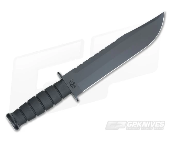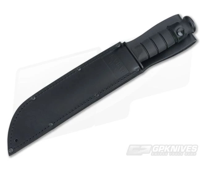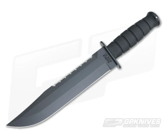 Kabar Big Brother Kraton G starts off with a whopping 9 1/4″ 1095 Cro-Van high carbon dual-edged steel blade. It has a non-reflective black epoxy powder coating with a bottom plain edge and a top serrated edge. The superior grip Kraton G classic oval handle is nearly immune to sweat, chemicals, water and wear, and has a stainless steel butt cap and guard. Includes a black leather belt carry sheath stamped Ka-Bar U.S.A. on the front.