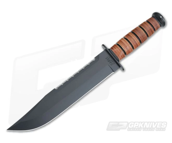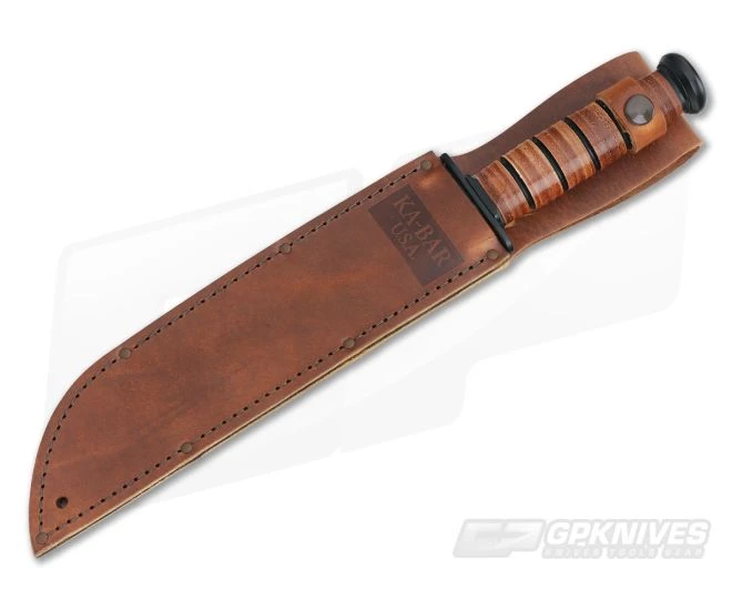 Kabar Big Brother Leather starts off with a massive 9 1/4″ 1095 Cro-Van high carbon dual-edged steel blade. It has a non-reflective black epoxy powder coating with a bottom plain edge and a top serrated edge. The handsome brown stacked leather handle provides a classic look with superior grip, and has a stainless steel butt cap and guard. Includes a brown leather belt carry sheath stamped Ka-Bar U.S.A. on the front.