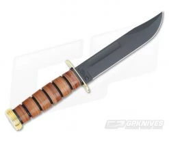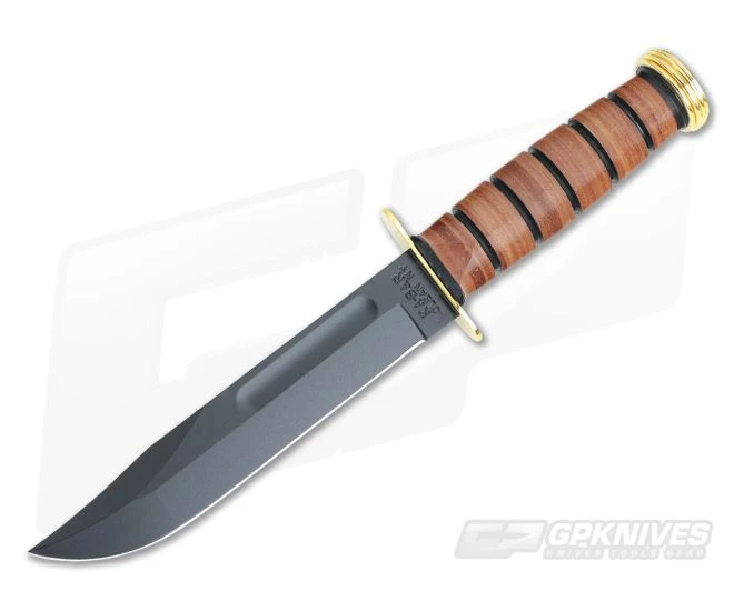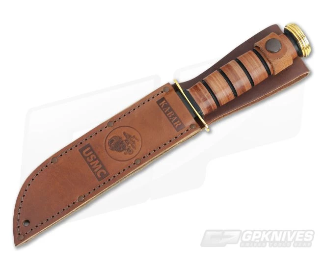Kabar USMC Knife with black coated plain edge 1095 Cro-Van blade and leather wrapped handle. Gold plated brass butt cap and guard. Black leather belt sheath. Perfect for gift giving and celebrating a military anniversary, a retirement, a reunion memento, or just to showcase your pride in serving the U.S.A.