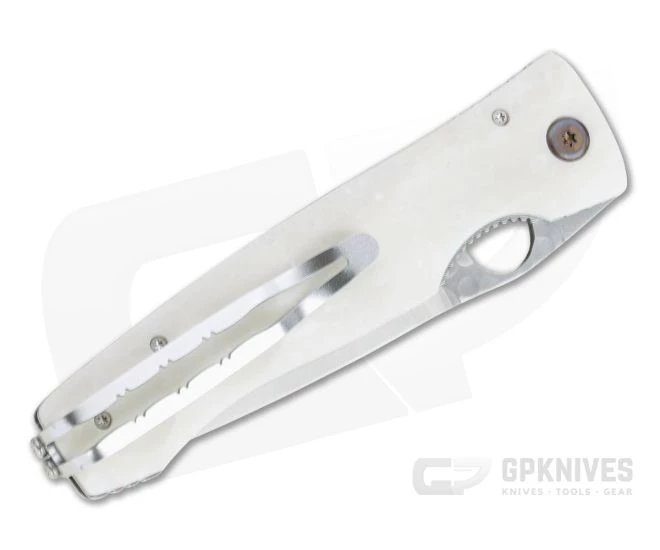 Handle: Robust steel liners support stylish and rugged white Corian handle scales that are grooved for added traction. Corian is a smooth, durable and stain resistant material often used in counter tops and makes a functional and striking handle material with a satin finish that highlights the unique grain of the material. Strategic jimping around the handle offers added security in multiple grips while the clean, tapered design is ergonomic for use. The liner lock mechanism is smooth, simple and reliable for use.