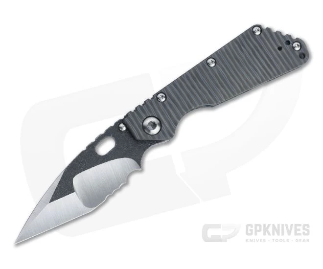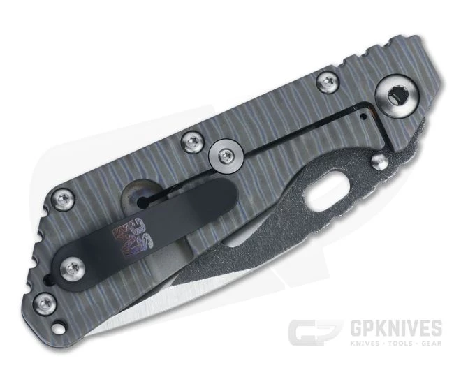 The Strider SMF is a full-sized tactical folder built like a tank and delivering powerful cutting performance. This Mick Strider Custom SMF has style to spare while retaining the proven design that makes the SMF the standard in the tactical knife class. This unique MSC SMF Custom comes equipped with a two-tone, Nightmare Grind, partially serrated 20CV modified Tanto blade and flame anodized titanium frame lock construction.