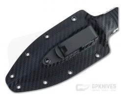 Carries via a carbon fiber pattern Kydex sheath with metal spring clip.
