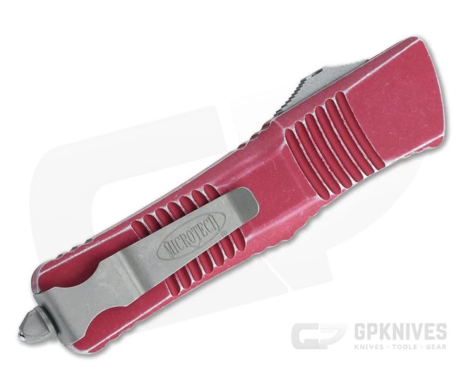 The Double Edge Combat Troodon out-the-front automatic knife by Microtech is a substantial tool, popular among military, law enforcement and first responders. Its large size lends itself to situations requiring a more robust cutting tool while remaining slender enough to keep on your person daily. Like its bird-like dinosaur namesake this Troodon is ready to strike. This version comes with an Apocalyptic Elmax double edge blade and distressed red anodized aluminum handles.