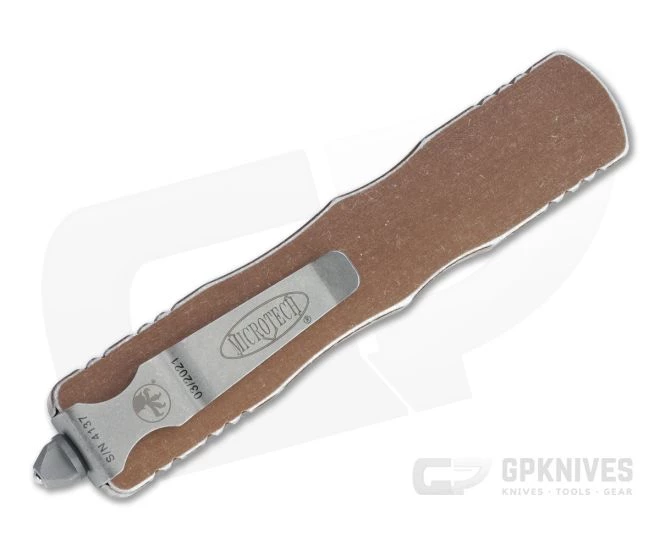 Handle: The generous handles accommodate the largest of hands even in gloves. Contoured, tan hard anodized 6061-T6 aluminum delivers an ergonomic and comfortable feel in-hand as well as a visually appealing shape with factory distressed finish for a rugged look. Strategically placed machine-grooved texturing on both edge enhances traction in hand while construction is completed with Microtech’s proprietary hardware, glass breaker end and pocket clip all in a matching Apocalyptic finish. The clip is marked with the individual serial number and date of production.