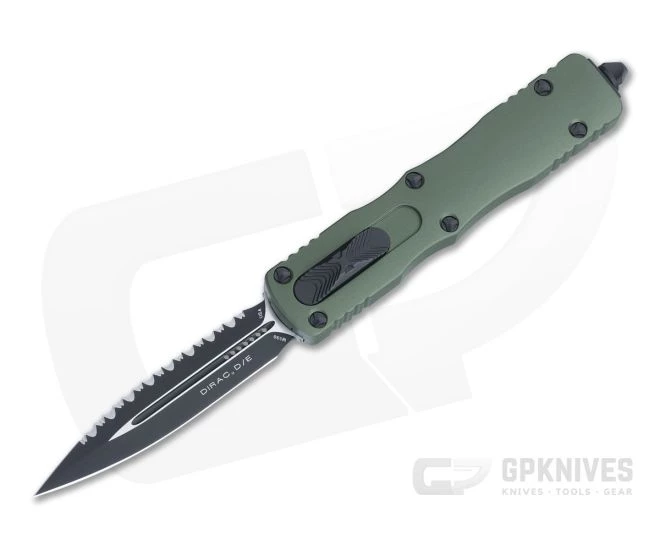 The Microtech Dirac takes the contours of the Halo, the size of the UTX-85 (just a bit smaller) and a top slide design and blends them together for a fantastic new every day carry auto from Microtech Knives. The double edge and top slide combination also make this Dirac fully ambidextrous, perfect for right or left-handed users! This version comes with black hardware, an OD Green handle and black coated M390 Double Edge blade: one plain and one fully serrated.