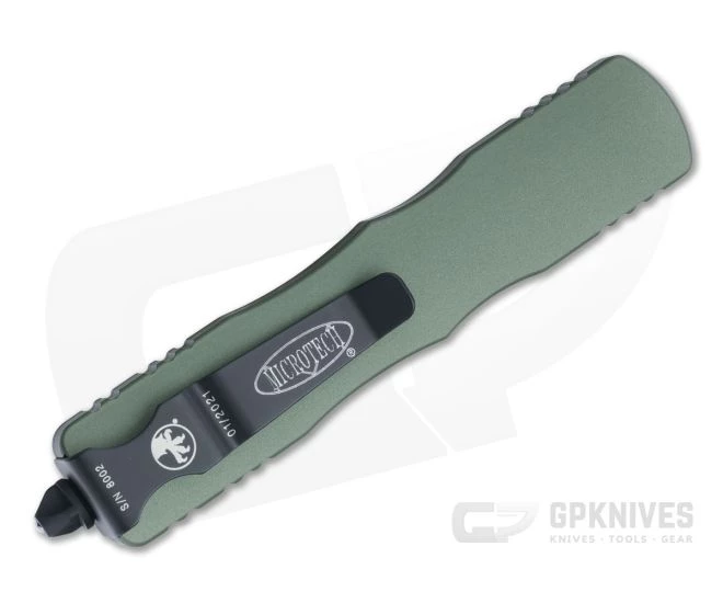 Handle: Smooth and contoured OD Green anodized 6061-T6 aluminum delivers an ergonomic and comfortable feel in-hand as well as a visually appealing shape. Several sections of machine-grooved texturing around the outsides enhance traction in hand. The handle’s construction is completed with Microtech’s proprietary hardware, glass breaker end and pocket clip all in a matching black finish. The clip is marked with the individual serial number and date of production.