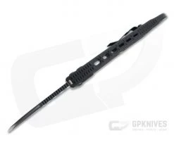 Blade:Â The large, curved hawkbill blade is M390 stainless steel with durable black Cerakote coating on the grinds and satin flats. Milled holes and a harpoon swedge deliver a futuristic style with devastating power from the fully serrated saber ground edge. Deployment is lightning quick via the large high traction button actuator.