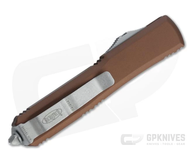 The Ultratech double action out-the-front automatic knife from Microtech sets the standard for the category. With a sleek yet robust design, precision American made construction and premium materials the Ultratech is a perfect everyday carry companion. This version has a contoured, tan anodized aluminum handle and an Apocalyptic M390 double edge blade.