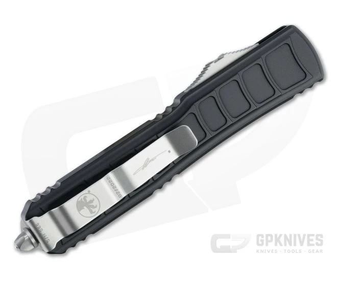 The Ultratech double action out-the-front automatic knife from Microtech sets the standard for the category. With a sleek yet robust design, precision American made construction and premium materials, the Ultratech is a perfect everyday carry companion. The Signature Series Ultratech II has Stepside modified handle milling for enhanced traction and weight reduction. This version has a black handle and partially serrated, stonewashed M390 Tanto blade.Â