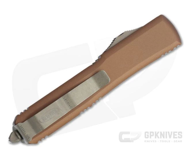 Handle:Â Smooth, tan hard anodized 6061-T6 aluminum handles have contoured edges creating a comfortable feel in-hand, smooth pocket transitions and a lighter more aesthetic design. Several areas of machine-grooved texturing around the handle add traction. Construction is completed with Microtech’s proprietary Bronzed hardware, glass breaker end and pocket clip with individual serial number/date of production.